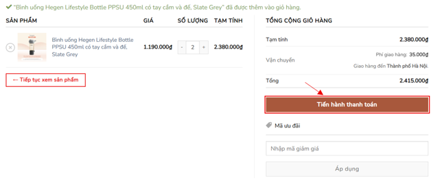Bước 3: Quý Khách hàng tiến hành điền mã giảm giá (nếu có) và nhấn chọn nút tiến hành thanh toán.