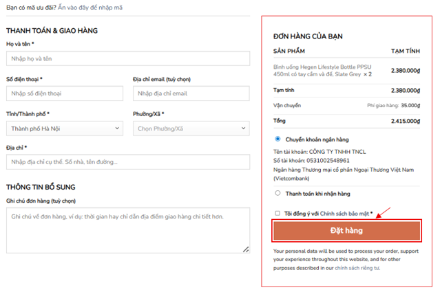 Sau đó, quý khách tiến hành điền thông tin giao hàng tạo form yêu cầu sau đó nhấn chọn “Đặt hàng”.