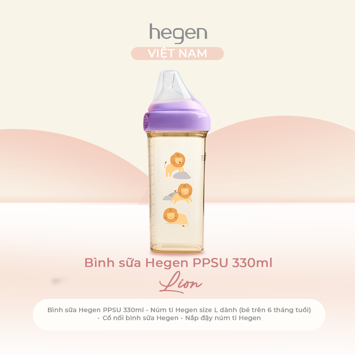 Bình sữa Hegen PPSU 330ml núm ti size L trên 6 tháng, Purple – Lion