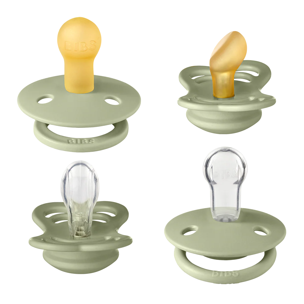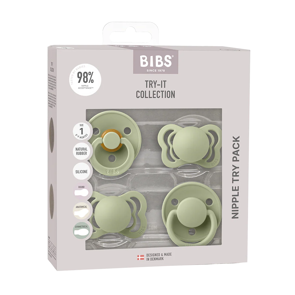 Bộ 4 ty ngậm 2 cao su, 2 silicone (2 tròn, 1 dẹt, 1 đối xứng) BIBS Try-it Collection Size 1 (0-6 tháng), Sage