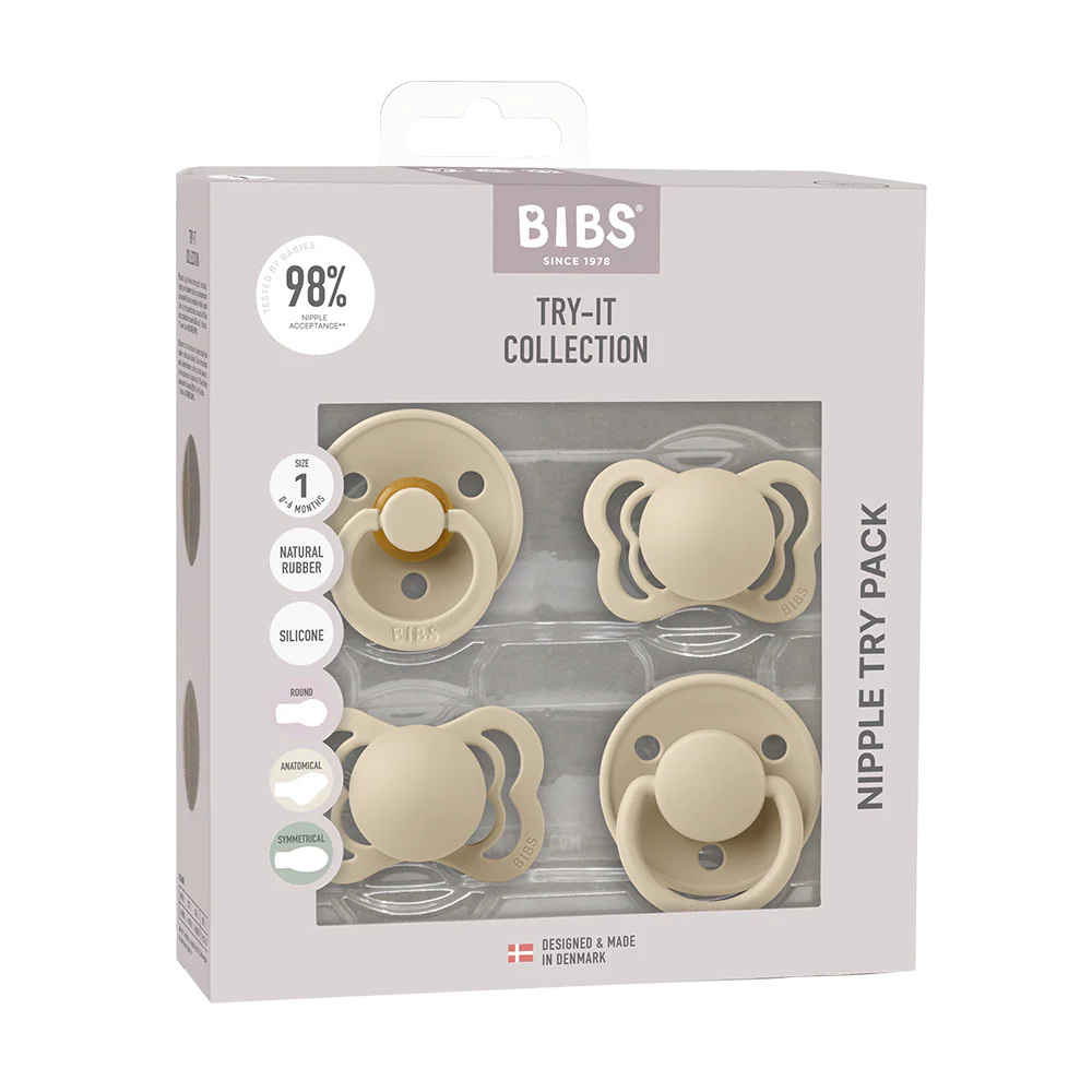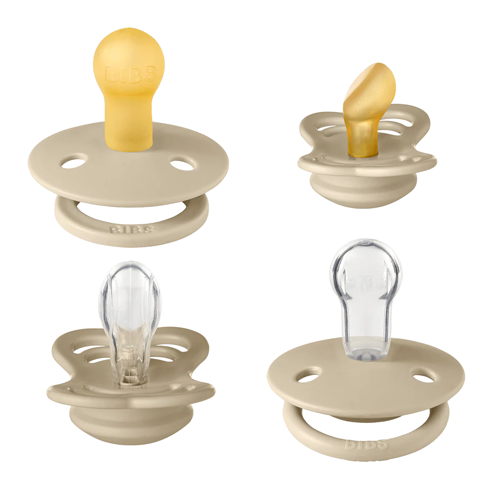 Bộ 4 ty ngậm 2 cao su, 2 silicone (2 tròn, 1 dẹt, 1 đối xứng) BIBS Try-it Collection Size 1 (0-6 tháng), Vanilla.