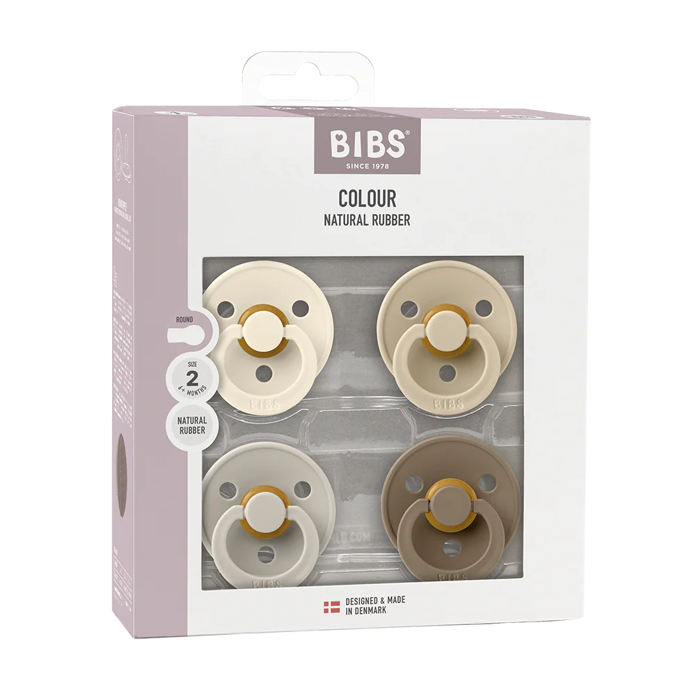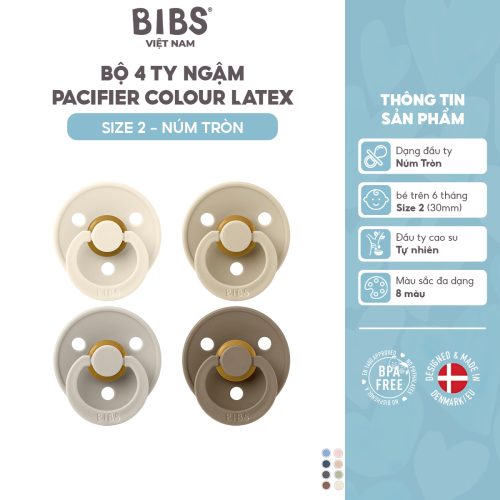 Bộ 4 ty ngậm núm tròn cao su BIBS Colour Latex Size 2 (trên 6 tháng), Ivory/Sand/Baby Blue/Iron.