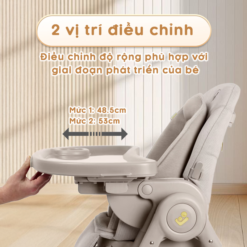 Mức 2: 53cm – nới rộng hơn, thoải mái khi bé lớn dần và cần thêm không gian. Giúp khay ăn đồng hành lâu dài qua từng giai đoạn phát triển của bé. - Khay ăn tháo rời dễ dàng: Thiết kế tiện lợi, chỉ với thao tác đơn giản là mẹ có thể tháo/lắp khay nhanh chóng để vệ sinh hoặc khi cần cho bé ra vào ghế.