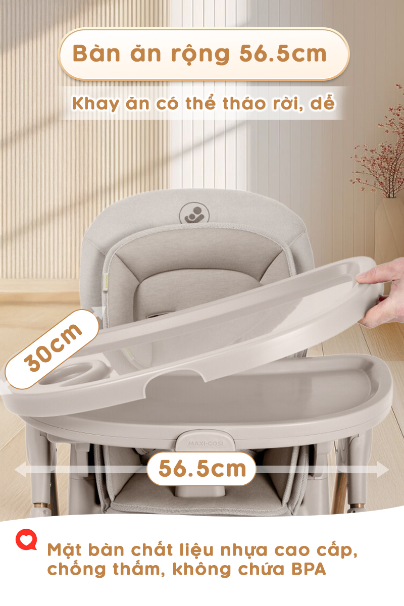 - Với khay ăn rộng rãi, chắc chắn và dễ vệ sinh, ghế ăn dặm Minla Plus Maxicosi mang đến cho bé trải nghiệm thoải mái và an toàn, đồng thời giúp mẹ tiết kiệm thời gian chăm sóc bé mỗi ngày.