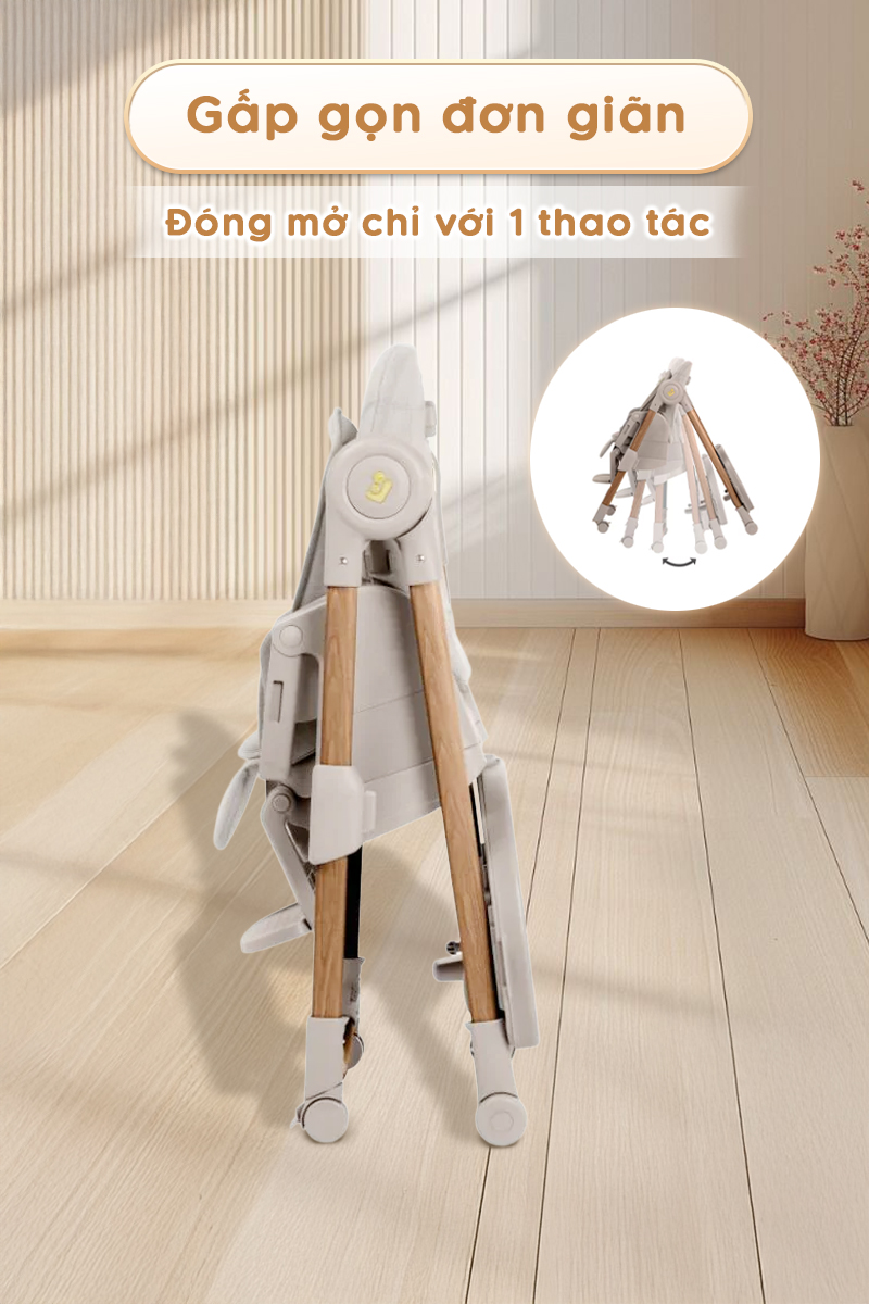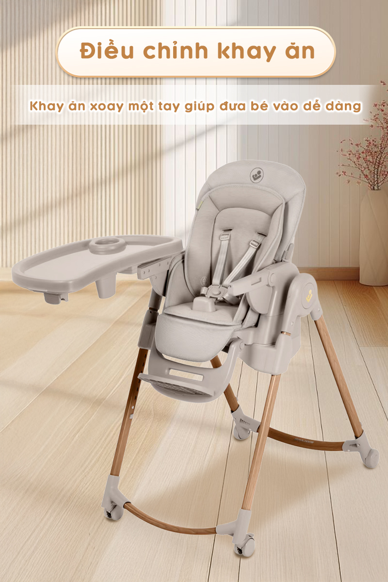- Cơ chế xoay thông minh: Khay ăn có thể xoay chỉ bằng một tay, giúp bố mẹ dễ dàng đưa bé vào hoặc bế bé ra khỏi ghế mà không cần tháo rời hoàn toàn.