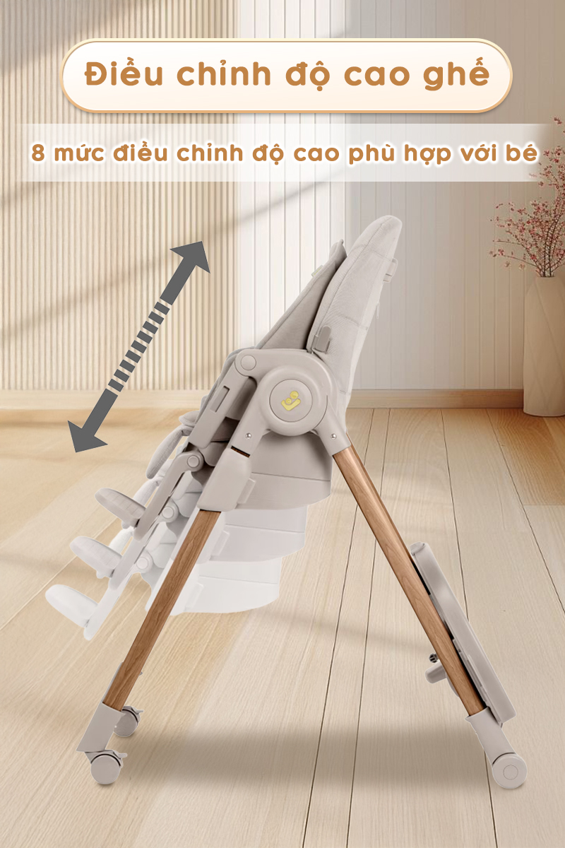 - An toàn & chắc chắn: Dù thay đổi ở mức độ cao nào, ghế vẫn giữ được sự ổn định, chắc chắn, đảm bảo an toàn tuyệt đối cho bé khi ngồi ăn hoặc vui chơi.