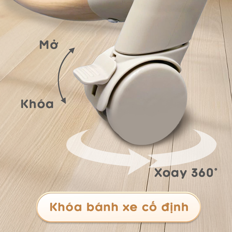 - Khóa bánh an toàn: Tích hợp chốt khóa chắc chắn, giữ ghế đứng yên tuyệt đối khi bé ngồi ăn hoặc vui chơi.