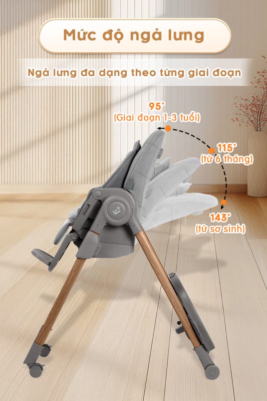 – Ghế có 3 mức độ ngả lưng chính, từ 95° đến 143°, đáp ứng nhu cầu từ lúc bé còn nhỏ đến khi bé ngồi ăn vững.