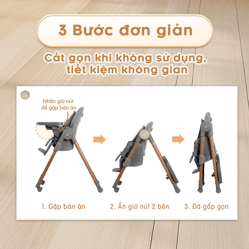 - Cơ chế xoay thông minh: Khay ăn có thể xoay chỉ bằng một tay, giúp bố mẹ dễ dàng đưa bé vào hoặc bế bé ra khỏi ghế mà không cần tháo rời hoàn toàn.