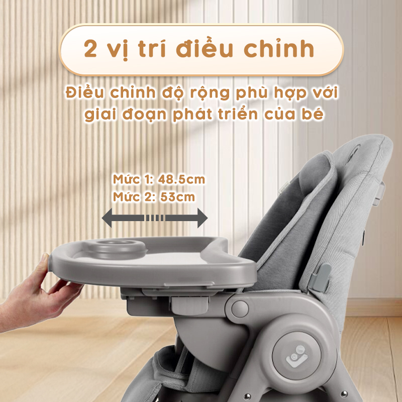 Mức 2: 53cm – nới rộng hơn, thoải mái khi bé lớn dần và cần thêm không gian. Giúp khay ăn đồng hành lâu dài qua từng giai đoạn phát triển của bé. - Khay ăn tháo rời dễ dàng: Thiết kế tiện lợi, chỉ với thao tác đơn giản là mẹ có thể tháo/lắp khay nhanh chóng để vệ sinh hoặc khi cần cho bé ra vào ghế.