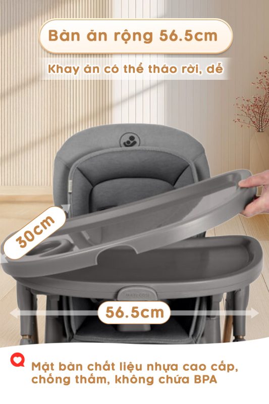 - Kết hợp với khả năng tháo rời và điều chỉnh độ rộng: Khay ăn Minla Plus Maxicosi không chỉ linh hoạt mà còn đa chức năng, phù hợp cho từng giai đoạn phát triển của bé.