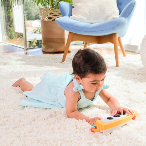 Ánh sáng và âm thanh từ piano làm bé hào hứng, muốn lại gần và chạm vào. Bé sẽ tự nhiên sẽ ngẩng đầu cao hơn để nhìn. Đưa tay ra phía trước để sờ hoặc đập vào phím. Đẩy thân người để lại gần hơn. Những chuyển động nhỏ này chính là cách bé tăng sức mạnh cổ – vai – tay theo từng ngày.