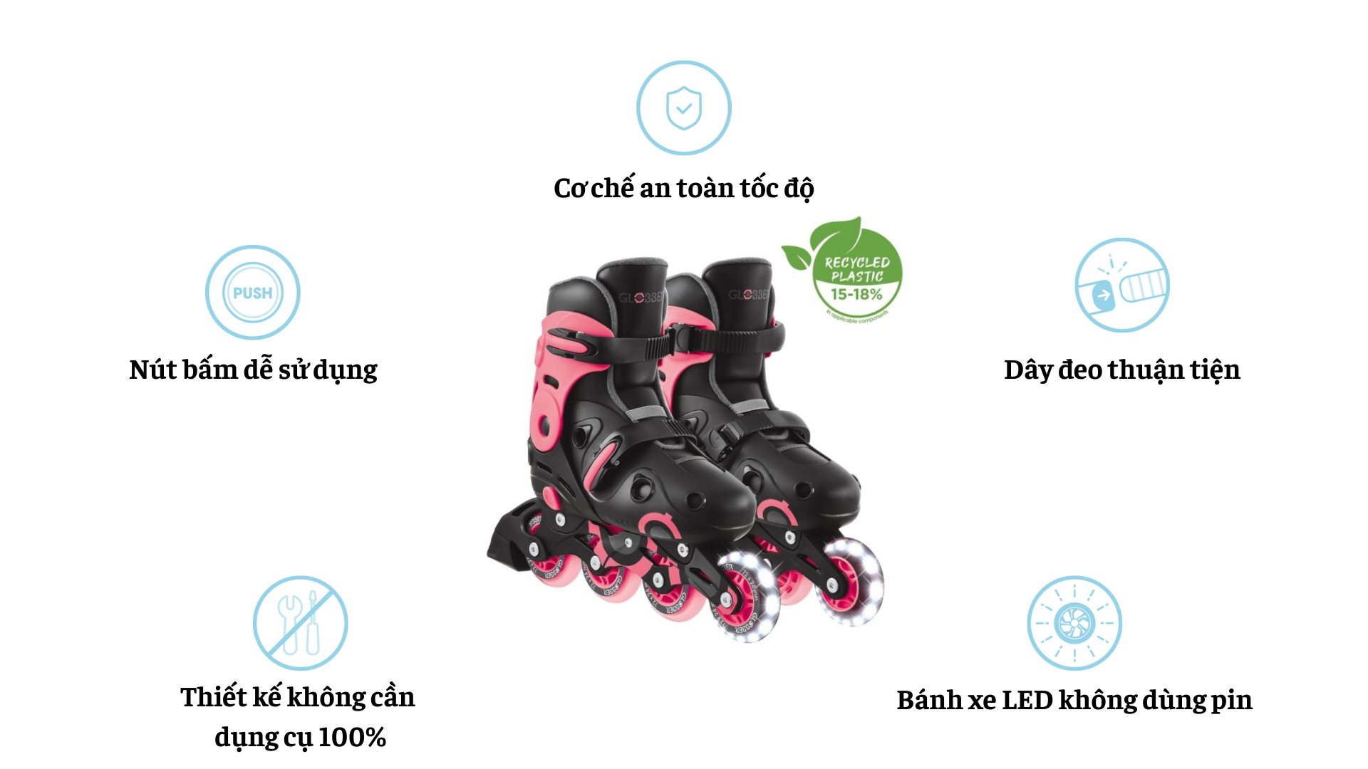 – GO SKATES LIGHTS được chế tạo với cơ chế an toàn tốc độ tiên tiến – hệ thống điều chỉnh tốc độ bánh xe dễ dàng điều chỉnh và hoàn toàn không cần dụng cụ. – — Chỉ cần xoay núm để tăng lực cản của hai bánh xe giữa. Điều này giúp hạn chế tốc độ và mang lại cho bé khả năng kiểm soát và ổn định tốt hơn khi học theo tốc độ của riêng mình, mang đến những buổi tập luyện an toàn và tự tin.