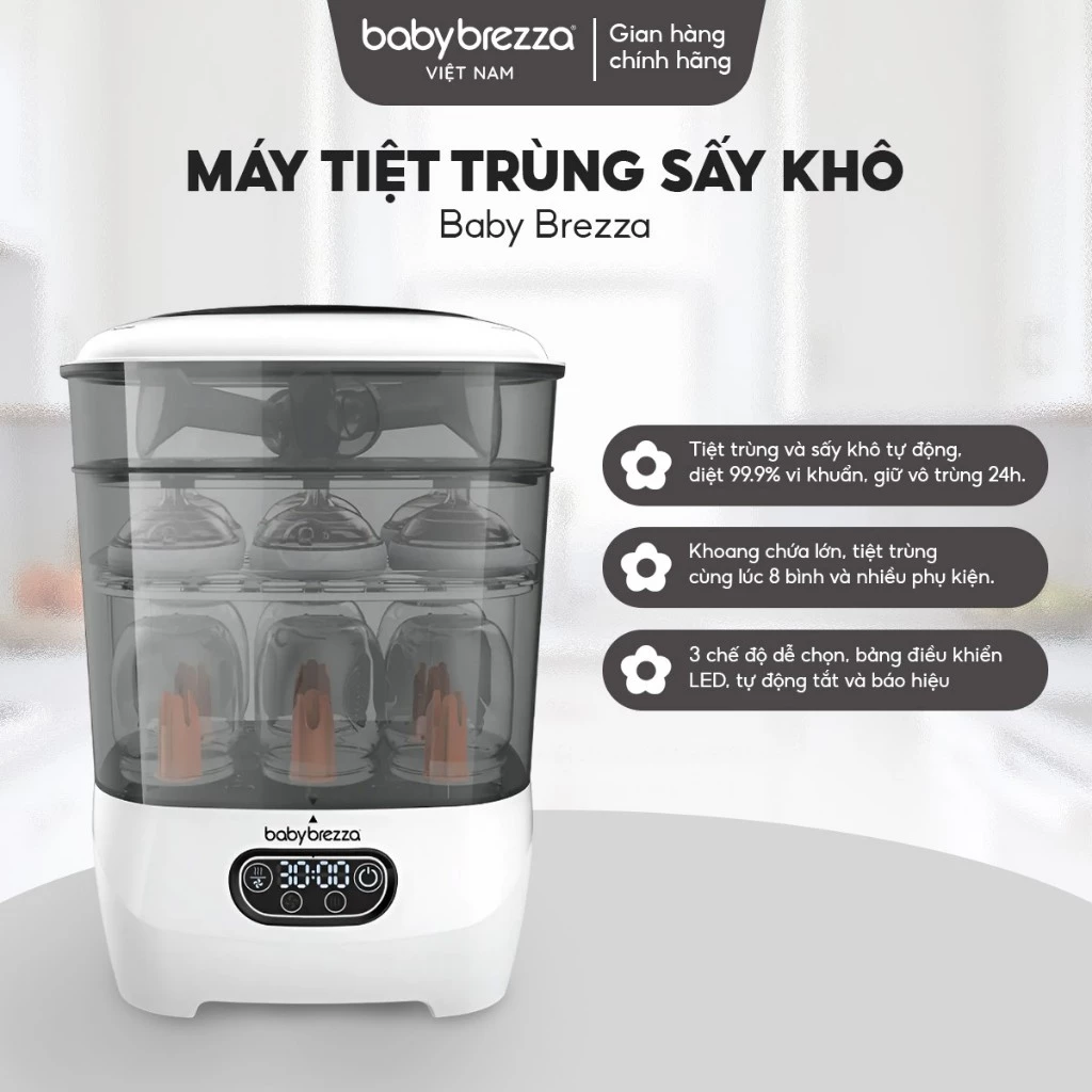 - Một điểm nổi bật của máy Baby Brezza hơn hẳn các máy tiệt trùng khác trên thị trường đó là: khi hết chế độ tiệt trùng, máy Baby Brezza sẽ chủ động phát ra tiếng “bíp bíp” cảnh báo nhắc nhở khi máy chuyển sang chế độ sấy khô.